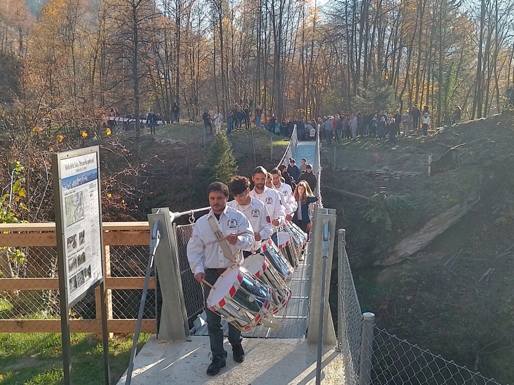 All’inaugurazione ha partecipato anche un apprezzato drappello del Gruppo Tamburini di Aquila che, percorrendo il ponte seguito da un gruppo di bambini, ha ufficialmente inaugurato la passerella. Ha poi fatto seguito un ricco aperitivo offerto alla popolazione e ai sostenitori al campo di calcio di Aquila.